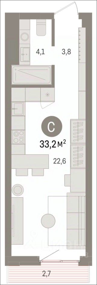 1-комн. студия от застройщика с предчистовой отделкой в ЖК "Квартал Траектория" на 14 этаже. Общая площадь: 33.2 кв.м., площадь гостиной 22.6 кв.м., из которых 5 кв.м. выделено под кухонную зону. Все окна выходят на одну сторону. В квартире один балкон, один совмещенный санузел. Высота потолков 2.82 м.