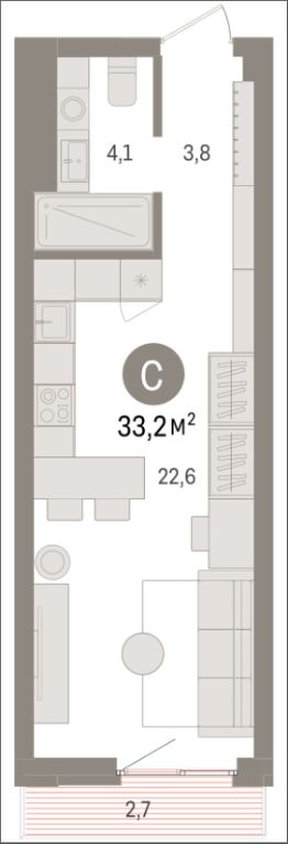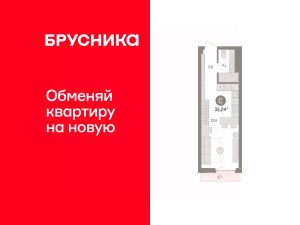 1-комн. студия с предчистовой отделкой в ЖК "Квартал Траектория" на 13 этаже. Общая площадь: 33.2 кв.м., площадь гостиной 22.6 кв.м., из которых 5 кв.м. выделено под кухонную зону. Все окна выходят на одну сторону. В квартире один балкон, один совмещенный санузел. Высота потолков 2.82 м.