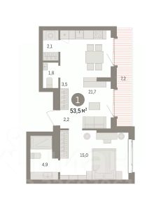 Просторная однокомнатная квартира с предчистовой отделкой в ЖК "Квартал Траектория" на 23 этаже. Общая площадь: 53.5 кв.м. Высота потолков 2.82 м.