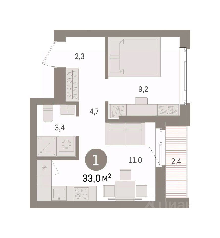 Квартира с кухней-гостиной и одной спальней в квартале "Траектория". Особенности планировки: лоджия, предчистовая отделка.