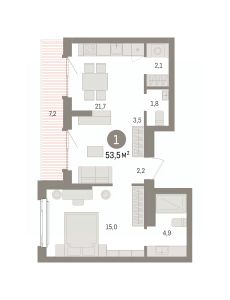 Квартира с кухней-гостиной и одной спальней в квартале "Траектория". Особенности планировки: балкон, гардеробная, мастер-спальня, постирочная, предчистовая отделка.