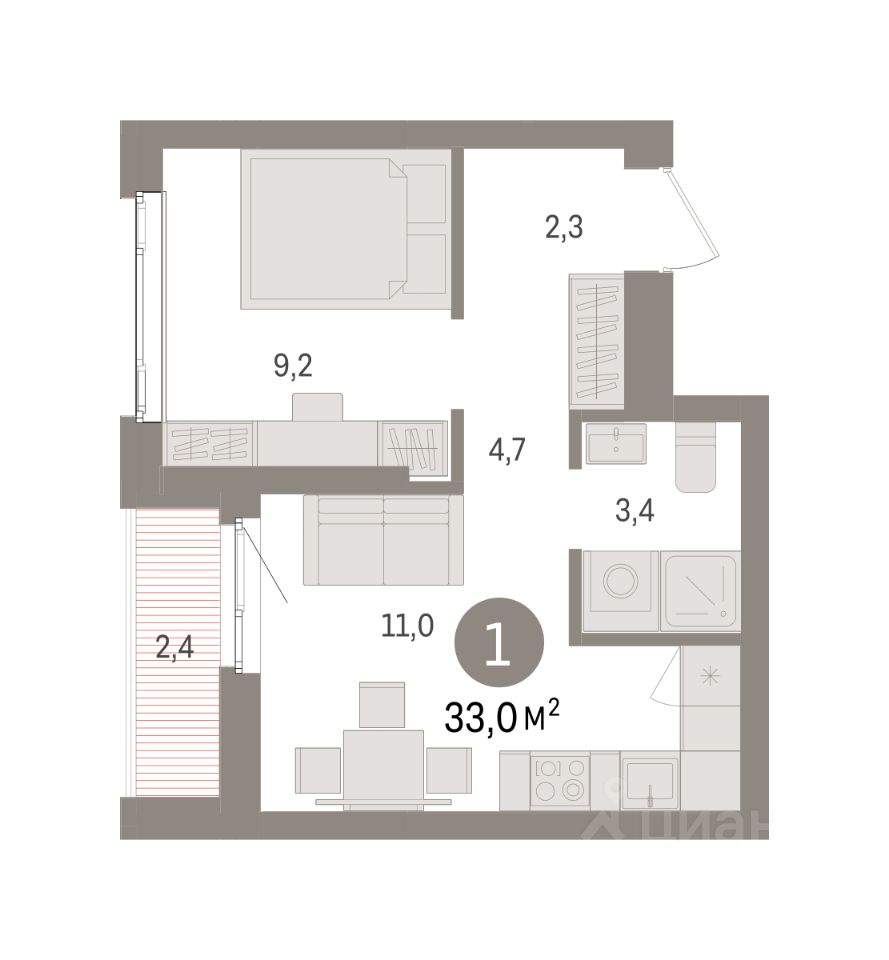 Квартира с кухней-гостиной и одной спальней в квартале "Траектория". Особенности планировки: лоджия, предчистовая отделка.