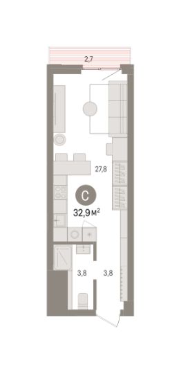 Просторная 1-комн. студия с предчистовой отделкой в ЖК "Квартал Траектория" на 18 этаже. Общая площадь: 32.9 кв.м. Высота потолков 2.82 м.