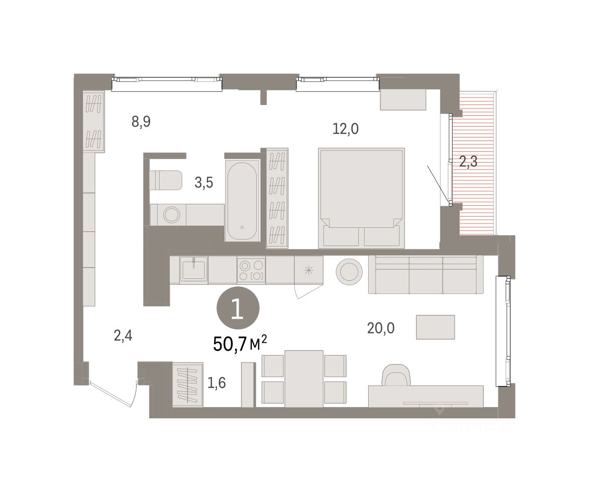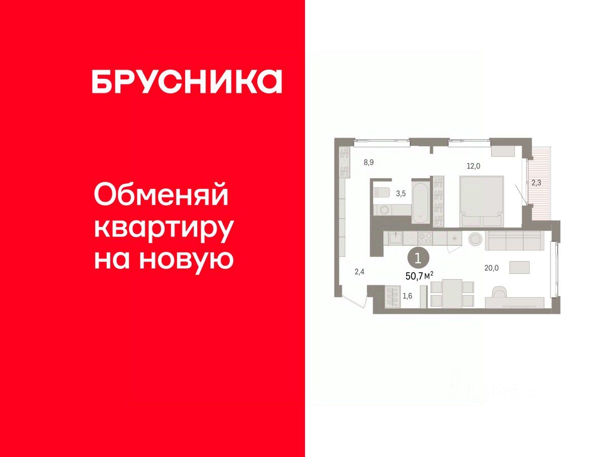 Квартира с кухней-гостиной и одной спальней в квартале "Траектория". Особенности планировки: гардеробная, предчистовая отделка, терраса на крыше.