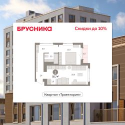 Однокомнатная квартира с предчистовой отделкой в ЖК "Квартал Траектория" на 13 этаже. Общая площадь: 50.7 кв.м. Высота потолков 2.82 м.