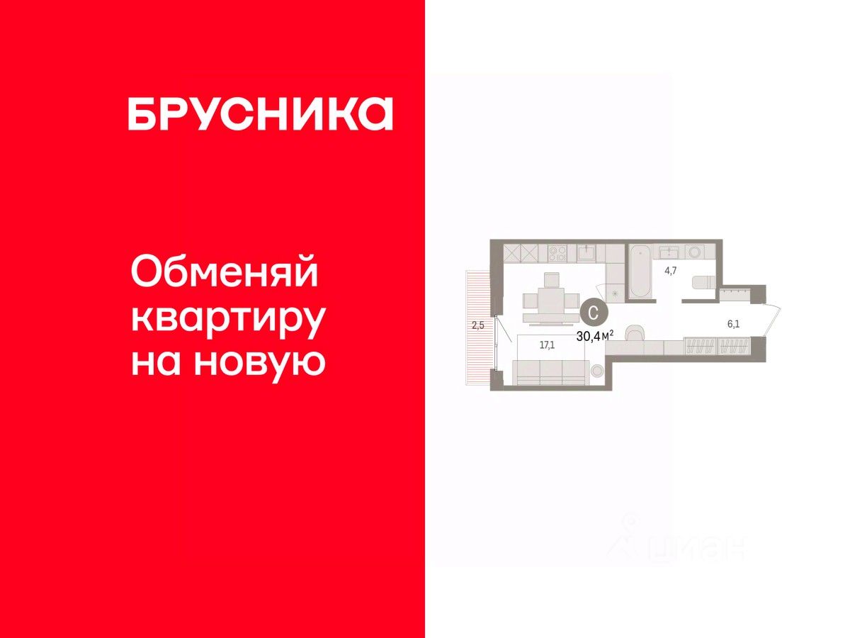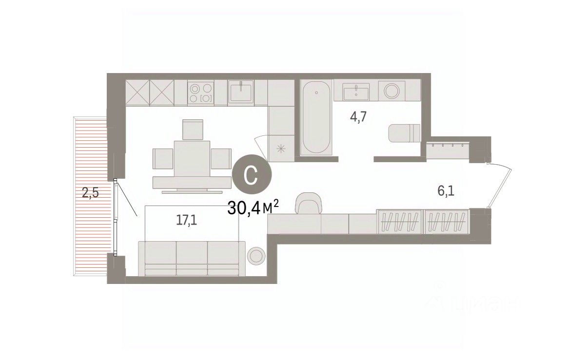 Однокомнатная студия с предчистовой отделкой в ЖК "Квартал Траектория" на 13 этаже. Общая площадь: 30.4 кв.м., площадь гостиной 22.1 кв.м., из которых 5 кв.м. выделено под кухонную зону. Все окна выходят на одну сторону. В квартире один балкон, один совмещенный санузел. Высота потолков 2.82 м.