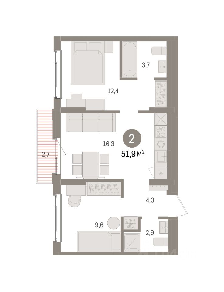Квартира с кухней-гостиной и двумя спальнями в квартале "Траектория". Особенности планировки: балкон, вид во двор, гардеробная, мастер-спальня, предчистовая отделка, разнесённые спальни.
