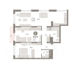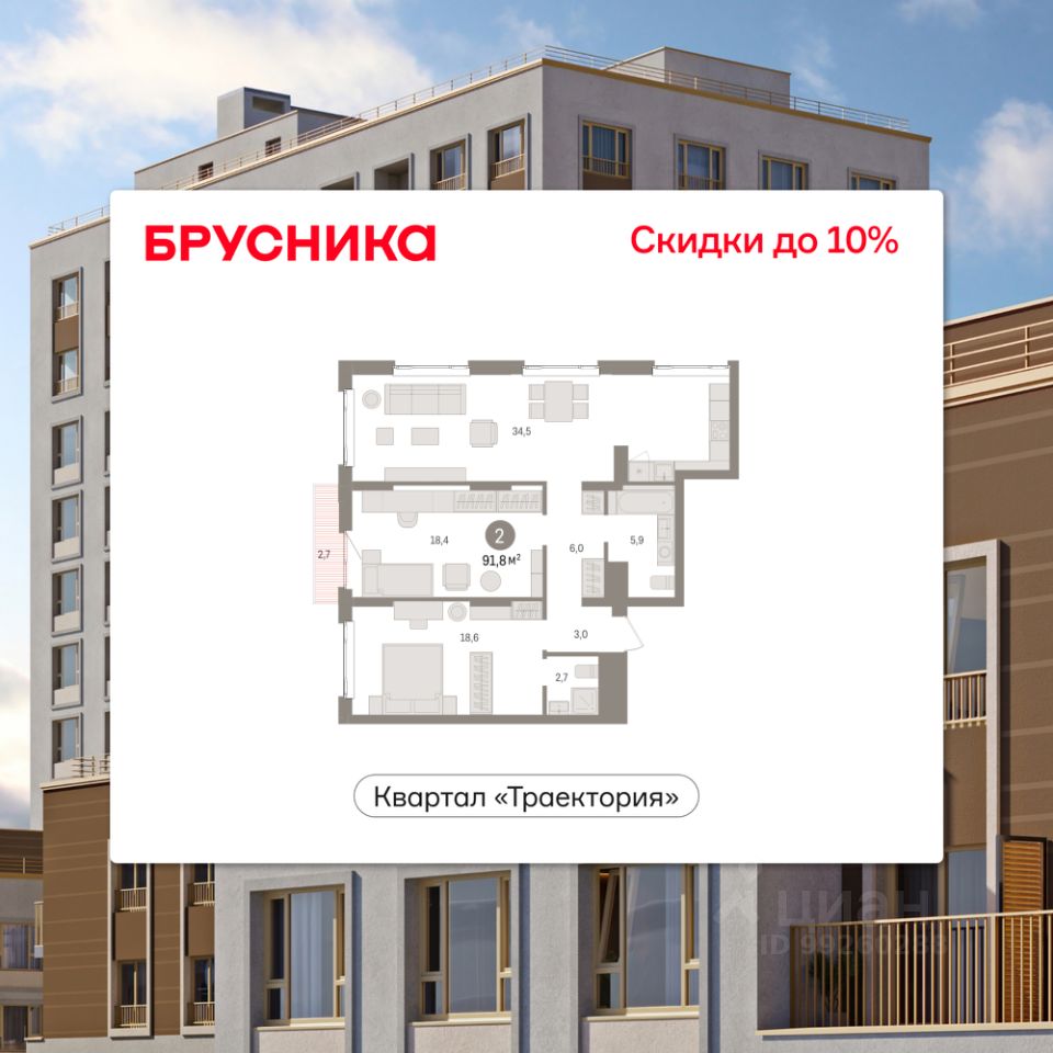 2-комн. квартира с предчистовой отделкой в ЖК "Квартал Траектория" на 14 этаже. Общая площадь: 91.8 кв.м. Высота потолков 2.82 м.
