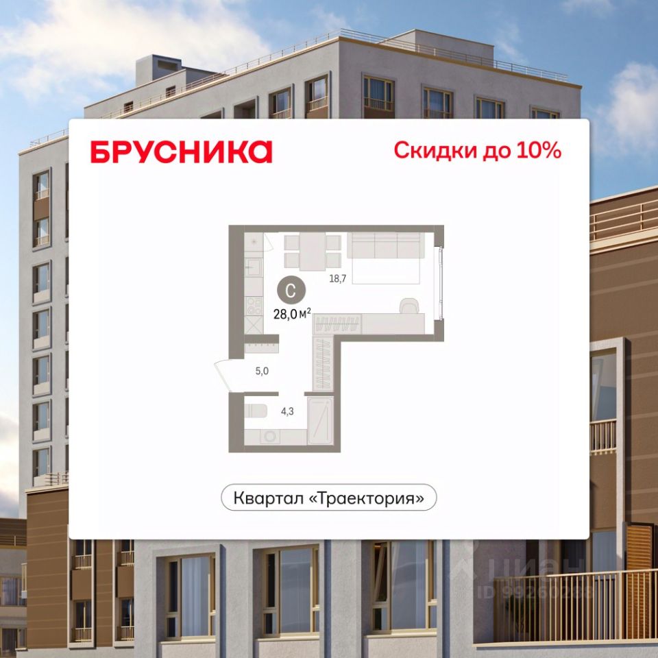 Однокомнатная студия от застройщика с предчистовой отделкой в ЖК "Квартал Траектория" на 5 этаже. Общая площадь: 28 кв.м. Высота потолков 2.82 м.