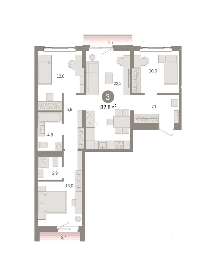 Квартира с кухней-гостиной и тремя спальнями в квартале "Траектория". Особенности планировки: балкон, вид во двор, лоджия, мастер-спальня, окна на две стороны, предчистовая отделка, разнесённые спальни.