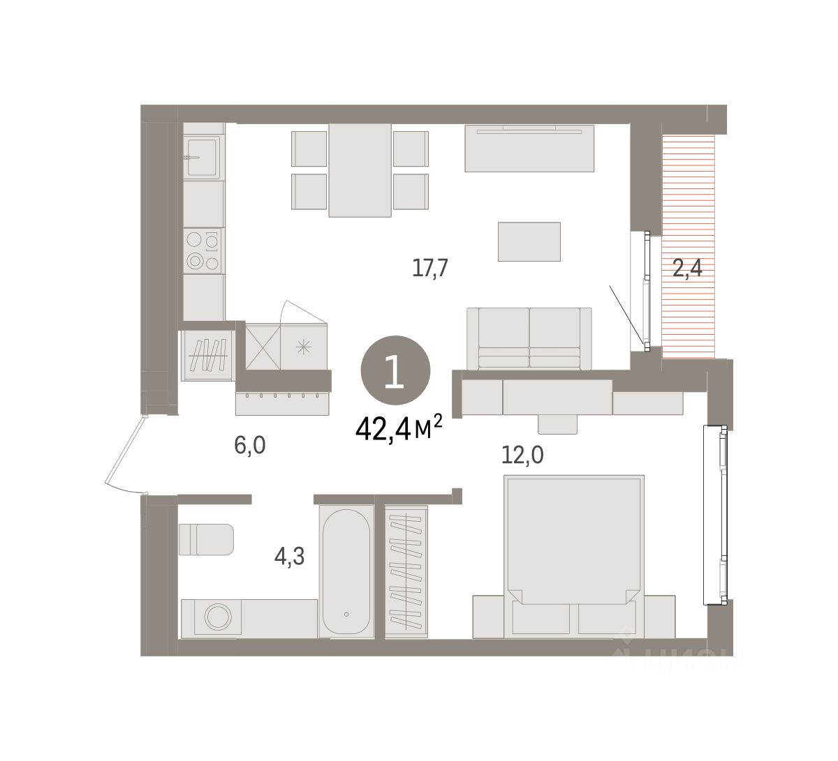 Просторная 1-комн. квартира с предчистовой отделкой в ЖК "Квартал Траектория" на 8 этаже. Общая площадь: 42.4 кв.м., жилая: 12 кв.м., площадь просторной кухни-столовой: 17.7 кв.м. Все окна выходят на одну сторону. В квартире одна лоджия, один совмещенный санузел. Высота потолков 2.82 м.