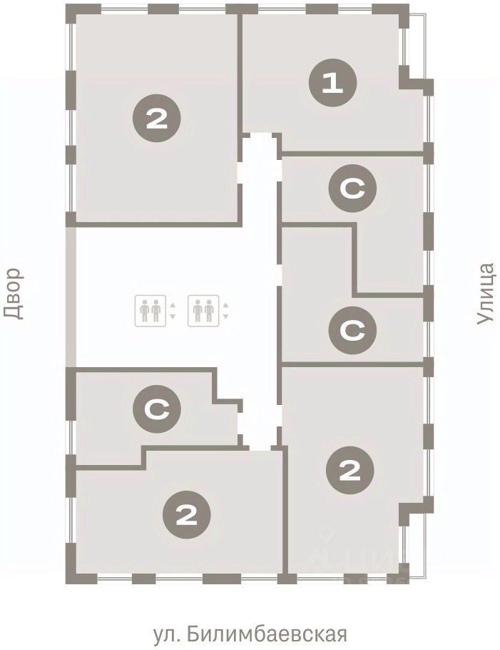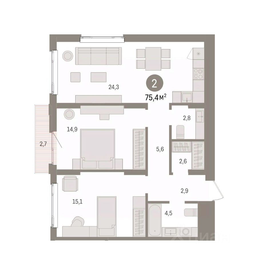Квартира с кухней-гостиной и двумя спальнями в квартале "Траектория". Особенности планировки: балкон, вид во двор, второй санузел, гардеробная, предчистовая отделка, разнесённые спальни.
