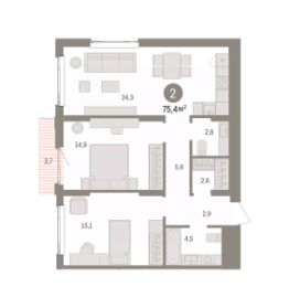 Просторная двухкомнатная квартира с предчистовой отделкой в ЖК "Квартал Траектория" на 13 этаже. Общая площадь: 75.4 кв.м., жилая: 30 кв.м., площадь просторной кухни-столовой: 24.3 кв.м. Угловая квартира, идеально подойдет любителям тишины и панорамных видов. В квартире один балкон, один совмещенный и один раздельный санузел. Высота потолков 2.82 м.