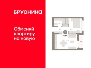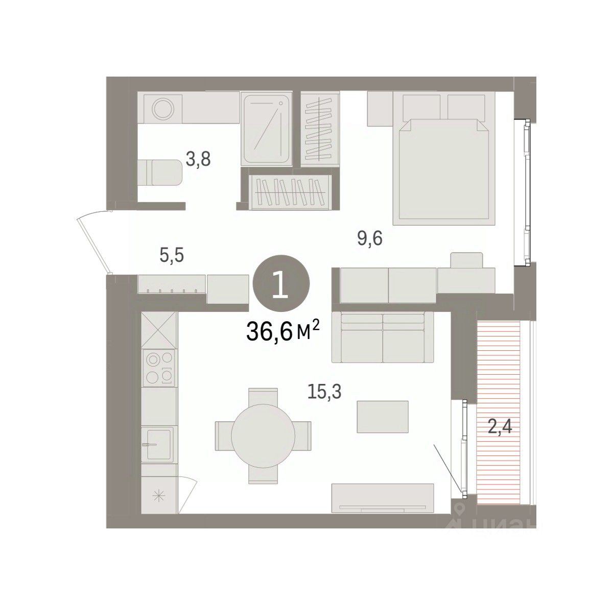 1-комн. квартира с предчистовой отделкой в ЖК "Квартал Траектория" на 5 этаже. Общая площадь: 36.6 кв.м., жилая: 9.6 кв.м., площадь просторной кухни-столовой: 15.3 кв.м. Все окна выходят на одну сторону. В квартире одна лоджия, один совмещенный санузел. Высота потолков 2.82 м.