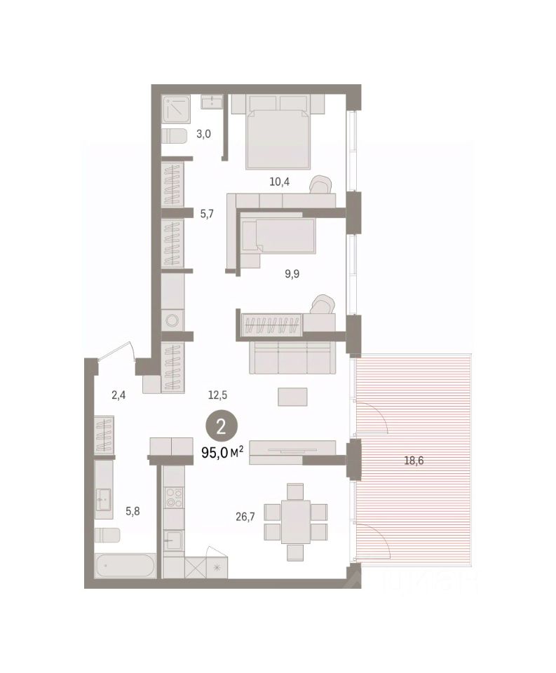Квартира с кухней-гостиной и двумя спальнями в квартале "Траектория". Особенности планировки: вид во двор, гардеробная, мастер-спальня, панорамное остекление, потолки 3 м и выше, предчистовая отделка, разнесённые спальни, терраса.