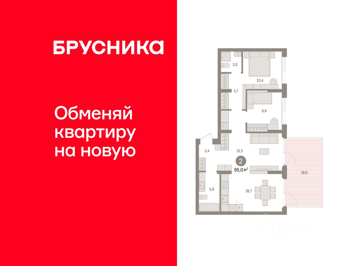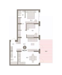 Двухкомнатная квартира с предчистовой отделкой в ЖК "Квартал Траектория" на 2 этаже. Общая площадь: 95 кв.м. Высота потолков 2.82 м.
