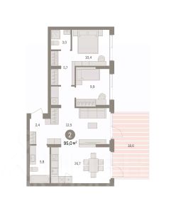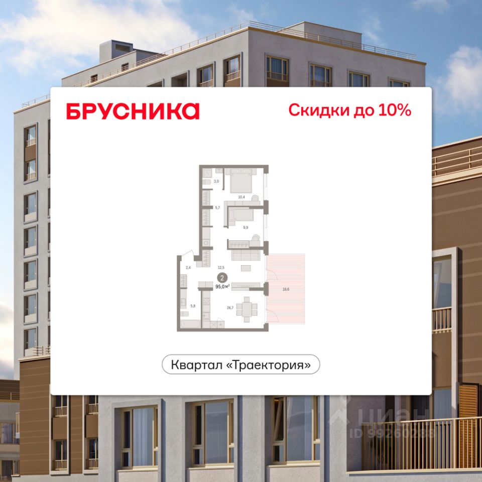 Продается 2-комн. квартира от застройщика с предчистовой отделкой в ЖК "Квартал Траектория" на 2 этаже. Общая площадь: 95 кв.м. Высота потолков 2.82 м.