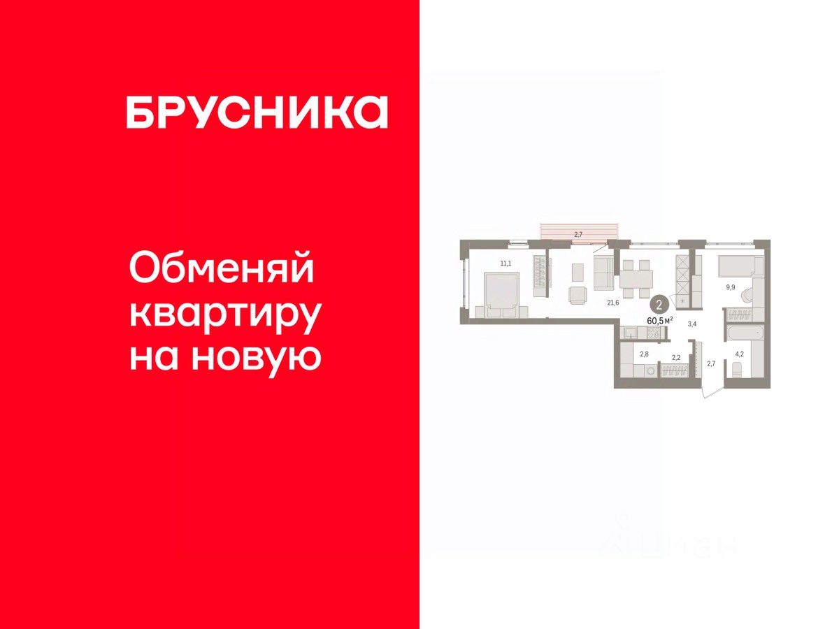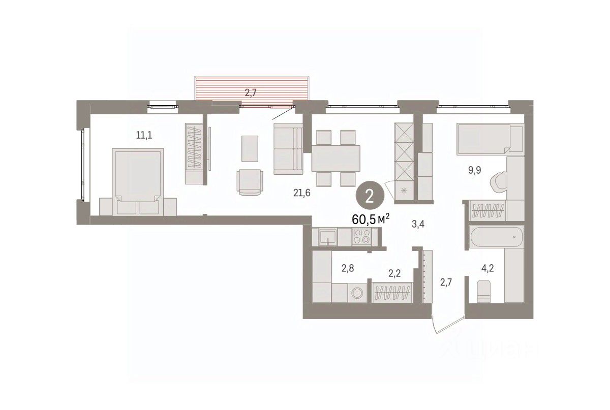 Просторная двухкомнатная квартира с предчистовой отделкой в ЖК "Квартал Траектория" на 5 этаже. Общая площадь: 60.5 кв.м. Высота потолков 2.82 м.