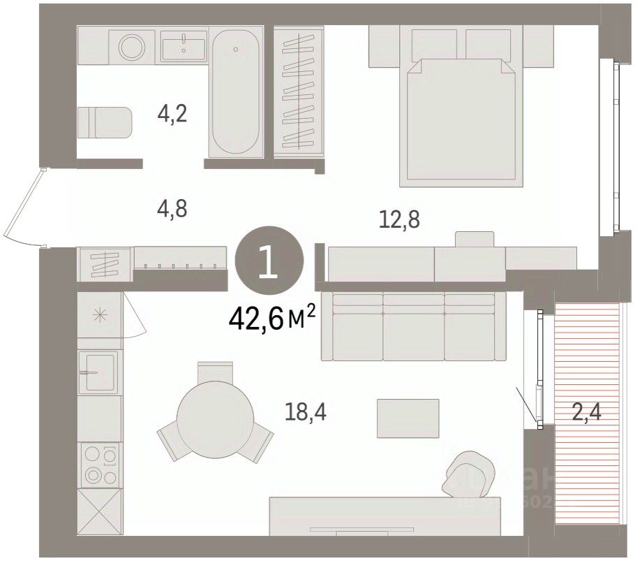 Продается однокомнатная квартира от застройщика с предчистовой отделкой в ЖК "Квартал Траектория" на 10 этаже. Общая площадь: 42.6 кв.м., жилая: 12.8 кв.м., площадь просторной кухни-столовой: 18.4 кв.м. Все окна выходят на одну сторону. В квартире одна лоджия, один совмещенный санузел. Высота потолков 2.82 м.