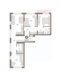 Трехкомнатная квартира с предчистовой отделкой в ЖК "Квартал Траектория" на 5 этаже. Общая площадь: 80.7 кв.м. Высота потолков 2.82 м.