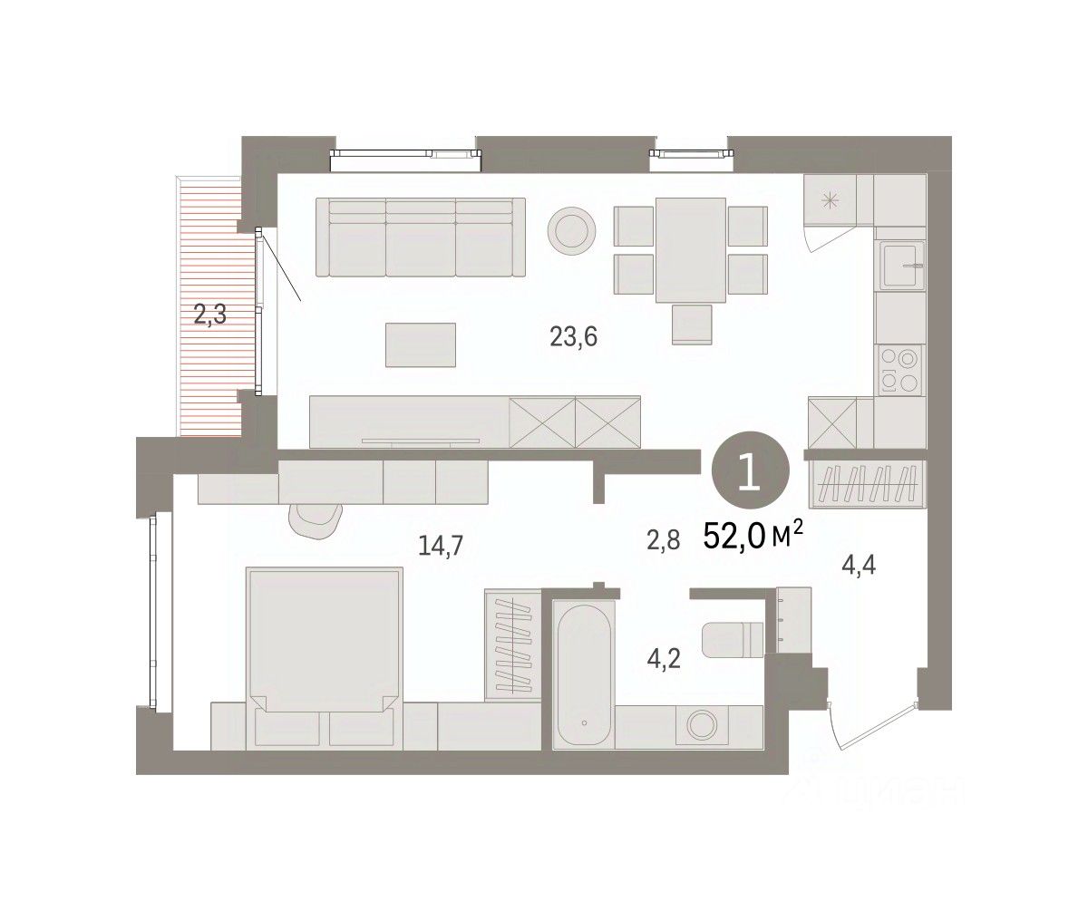 Квартира с кухней-гостиной и одной спальней в квартале "Траектория". Особенности планировки: предчистовая отделка, терраса на крыше.
