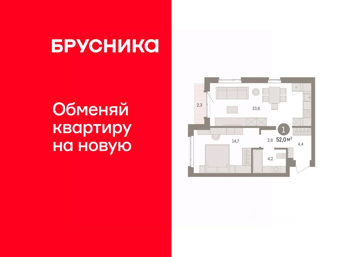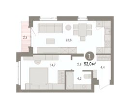 1-комн. квартира от застройщика с предчистовой отделкой в ЖК "Квартал Траектория" на 13 этаже. Общая площадь: 52 кв.м. Высота потолков 2.82 м.