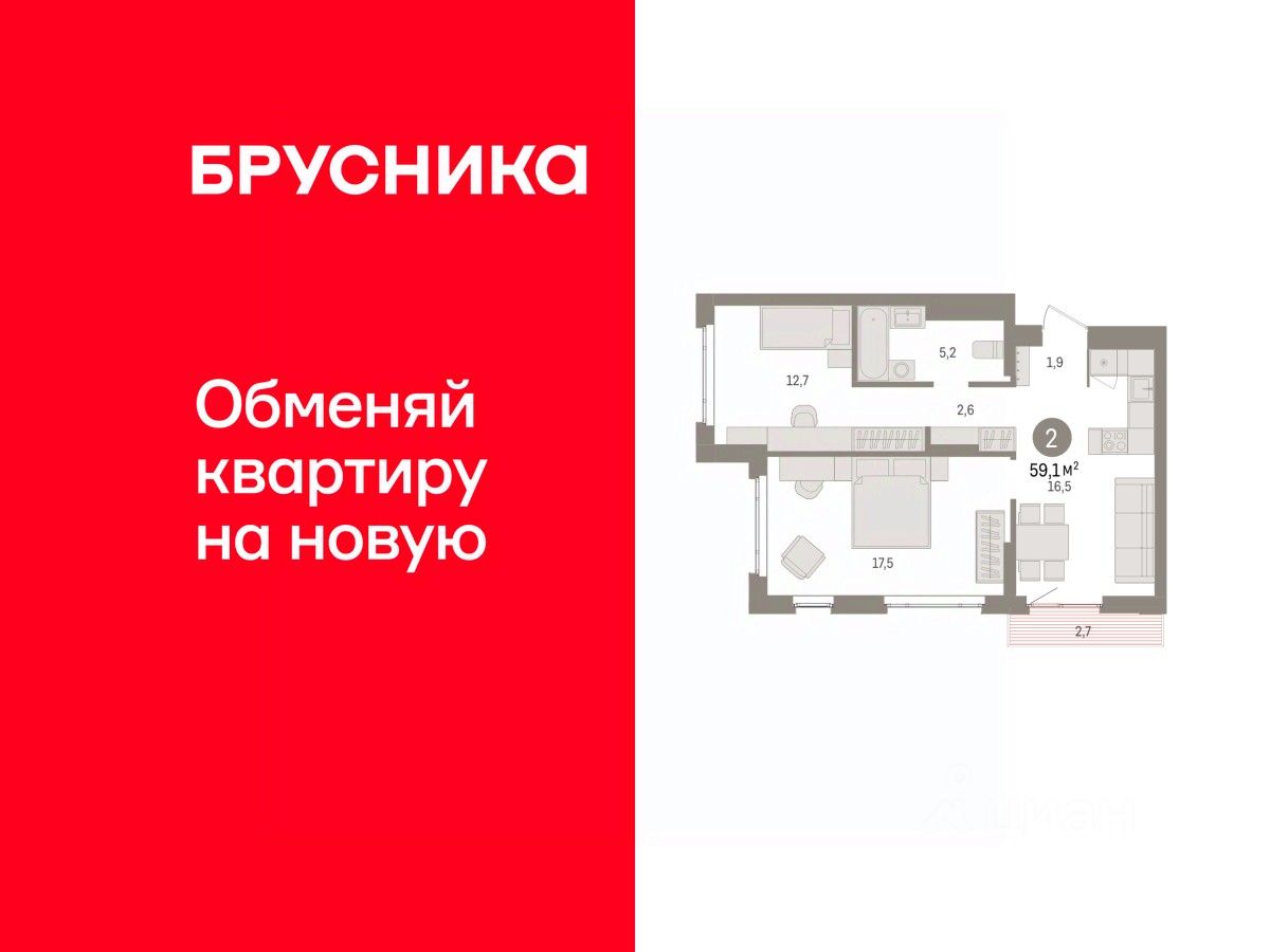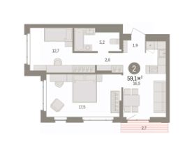 Просторная 2-комн. квартира с предчистовой отделкой в ЖК "Квартал Траектория" на 14 этаже. Общая площадь: 59.1 кв.м. Высота потолков 2.82 м.