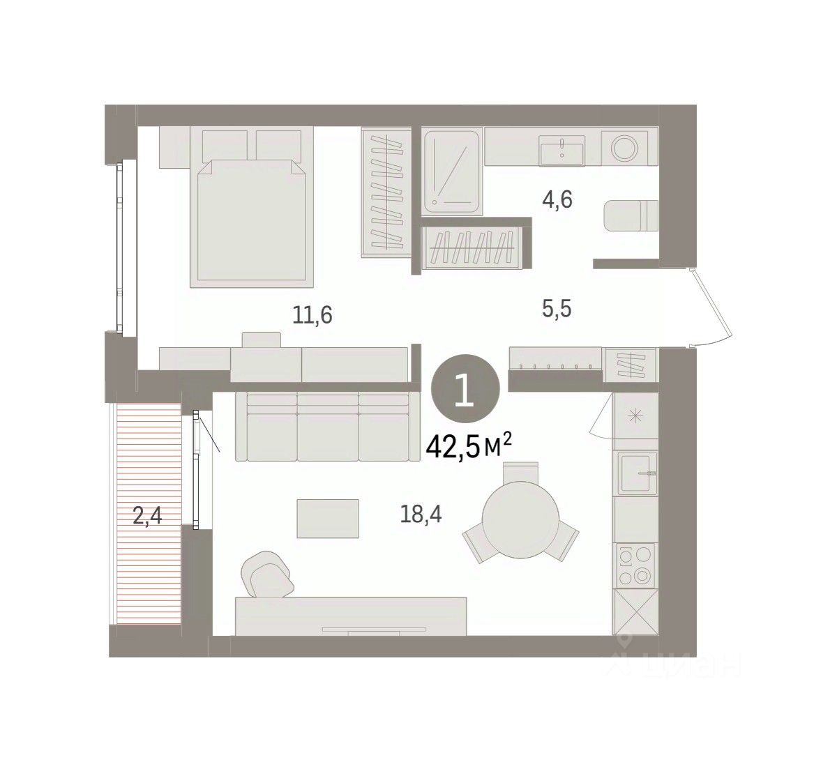 Квартира с кухней-гостиной и одной спальней в квартале "Траектория". Особенности планировки: лоджия, предчистовая отделка.