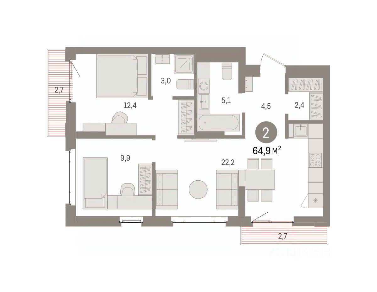 2-комн. квартира с предчистовой отделкой в ЖК "Квартал Траектория" на 9 этаже. Общая площадь: 64.9 кв.м., жилая: 22.3 кв.м., площадь просторной кухни-столовой: 22.2 кв.м. Квартира угловая, окна oбecпeчивaют paвнoмepнoe ocвeщeниe в тeчeниe дня. В квартире два балкона, два совмещенных санузла. Высота потолков 2.82 м.