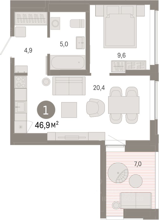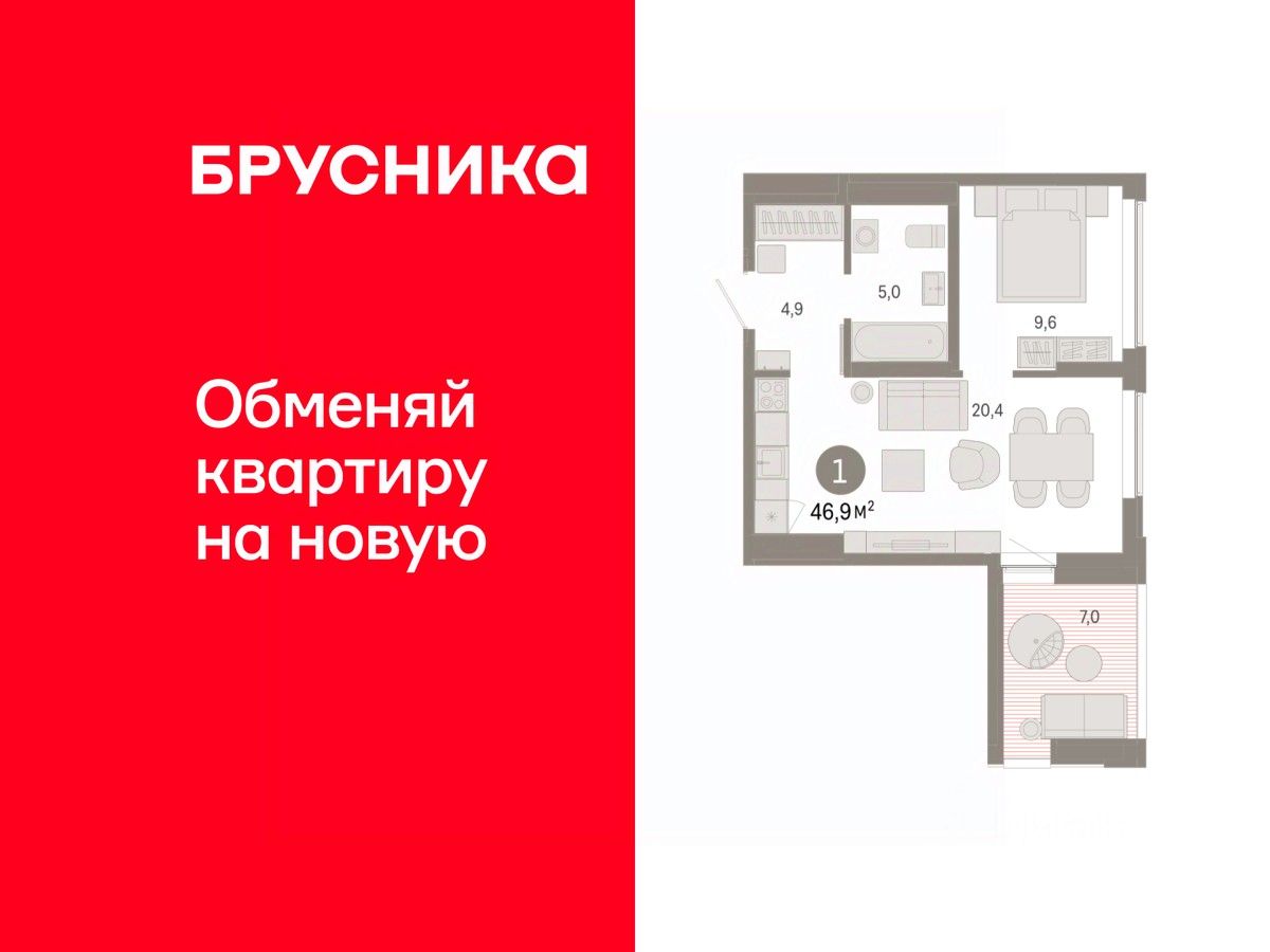 Квартира с кухней-гостиной и одной спальней в районе Шишимская горка. Особенности планировки: предчистовая отделка, разнесённые спальни, терраса на крыше.