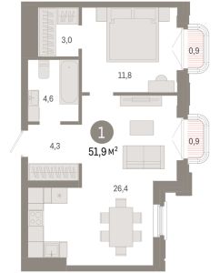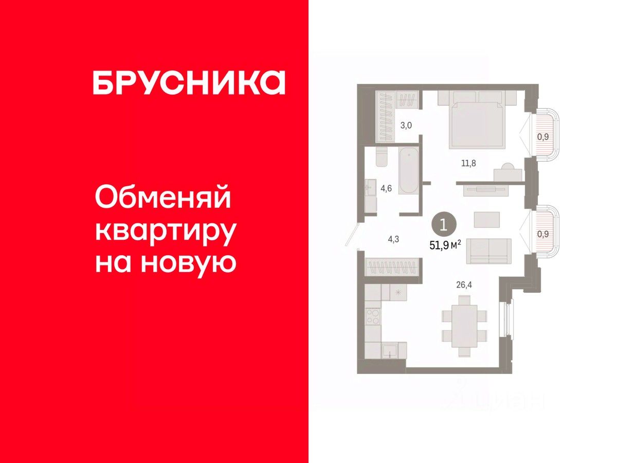Квартира с кухней-гостиной и одной спальней в квартале "На Некрасова". Особенности планировки: балкон, вид во двор, предчистовая отделка.