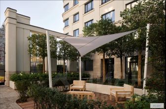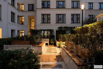 Вход во двор организован через колоннаду. Планировочно он разделён на две части. Парадный партер с большим количеством стриженых растений, фонтанами, цветущими кустарниками и более "домашняя", уютная зона, где высажены деревья и низкорослые хвойные растения, многолетники. В центре двора — две детские площадки. #Z6EzE9