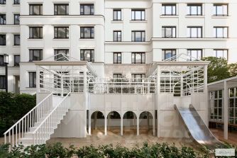 Вход во двор организован через колоннаду. Планировочно он разделён на две части. Парадный партер с большим количеством стриженых растений, фонтанами, цветущими кустарниками и более "домашняя", уютная зона, где высажены деревья и низкорослые хвойные растения, многолетники. В центре двора — две детские площадки. #ZmeZeB