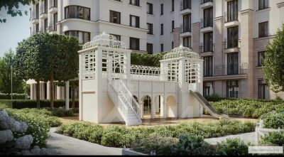 Вход во двор организован через колоннаду. Планировочно он разделён на две части. Парадный партер с большим количеством стриженых растений, фонтанами, цветущими кустарниками и более "домашняя", уютная зона, где высажены деревья и низкорослые хвойные растения, многолетники. В центре двора — две детские площадки. #Z6eZEC
