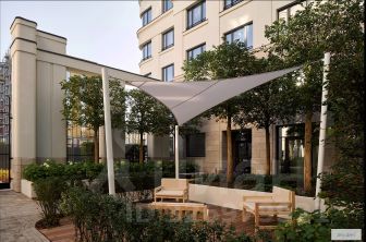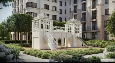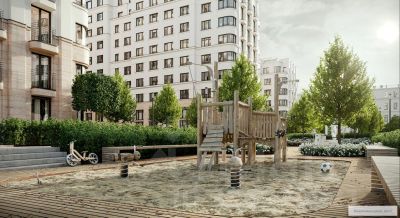 Вход во двор организован через колоннаду. Планировочно он разделён на две части. Парадный партер с большим количеством стриженых растений, фонтанами, цветущими кустарниками и более "домашняя", уютная зона, где высажены деревья и низкорослые хвойные растения, многолетники. В центре двора — две детские площадки. #2meZFU