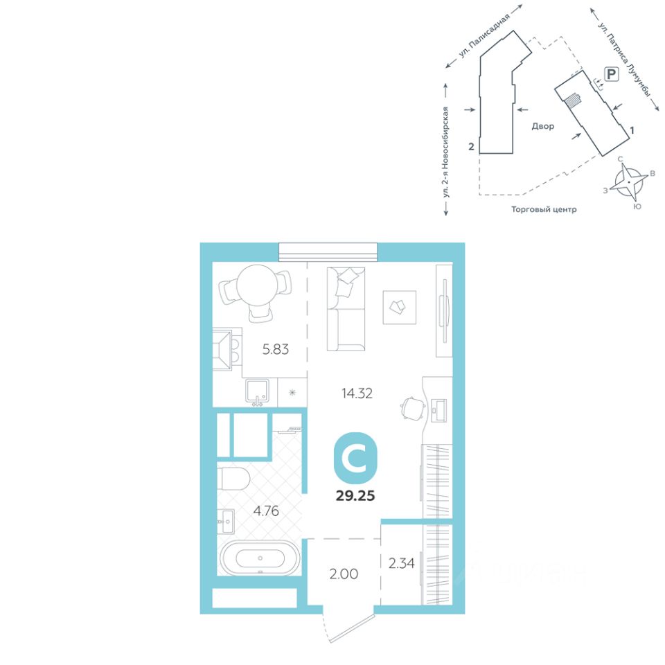В проекте представлены студии, классические одно- и двухкомнатные варианты, а также двух-, трех- и четырехкомнатные квартиры в евроформате площадью от 25,32 до 76,65.