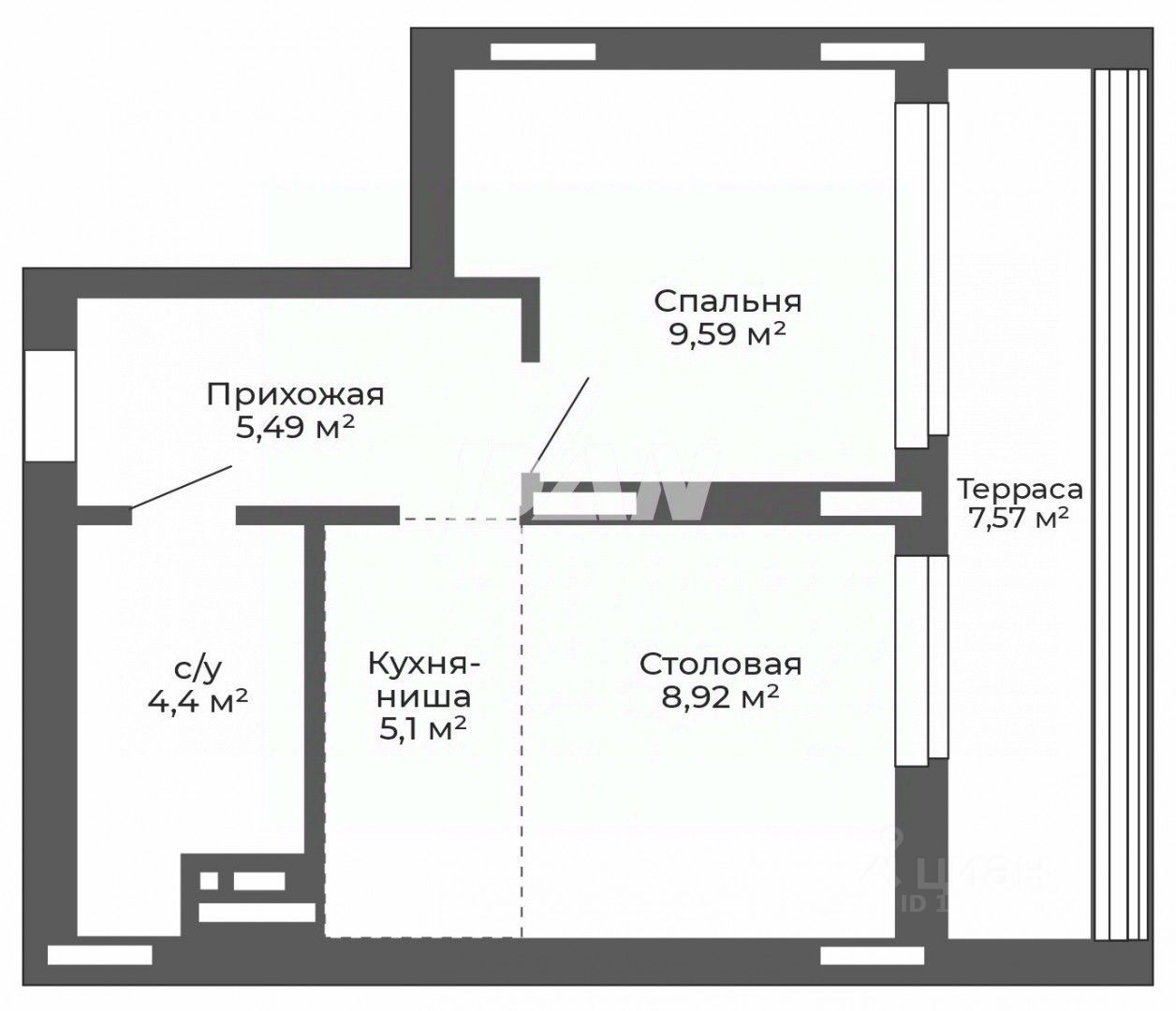 Функциональная планировка: столовая 8,92 кв.м,+кухня-ниша 5,10 кв.м, спальня 9,59 кв.м, прихожая 5,49 кв.м,санузел 4,40 кв.м и терраса 7,57 кв.м,