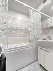 В квартире сделан хороший качественный ремонт в светлых тонах. На полу ламинат, проводка поменяна, натяжные потолки (кроме коридора), поменяны батареи, по всей квартире точечные светильники, ванна и туалет в кафеле. Балкон остеклен. Остается кухонный гарнитур.