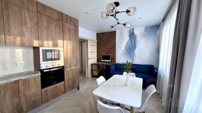 Кухонный гарнитур на заказ из австрийских материалов, фурнитура Вlum, встроенная техника Маunfеld (варочная поверхность, вытяжка, духовой шкаф, микроволновая печь, посудомоечная машина), встроенный холодильник Whirlрооl. В рабочей зоне тёплый пол. Два вида освещения, люстра + точечные светильники с регулировкой яркости света. Диван раскладывается в доп. спальные места.