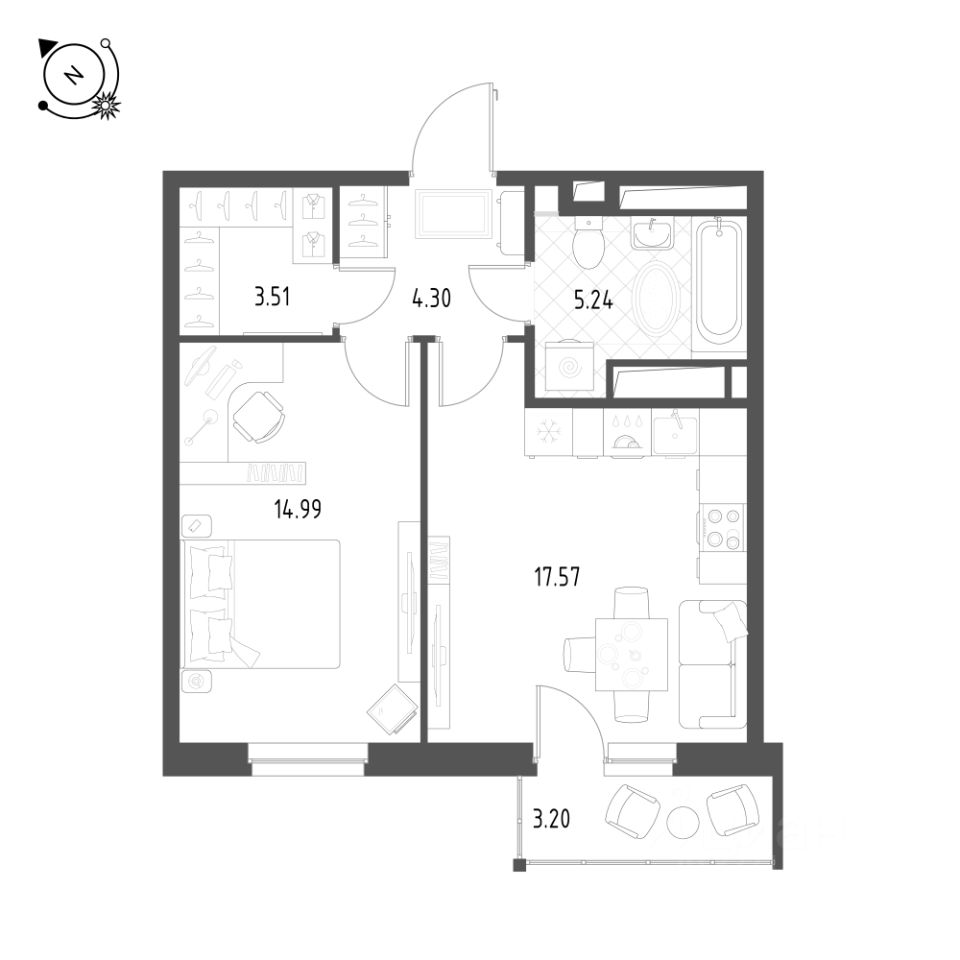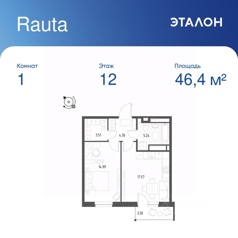 Общая площадь квартиры — 46.4 кв. м, этаж 12 из 25.