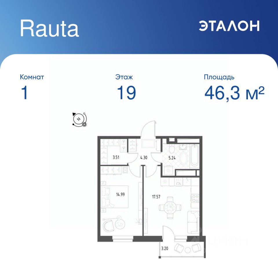 Общая площадь квартиры — 46.3 кв. м, этаж 19 из 25.