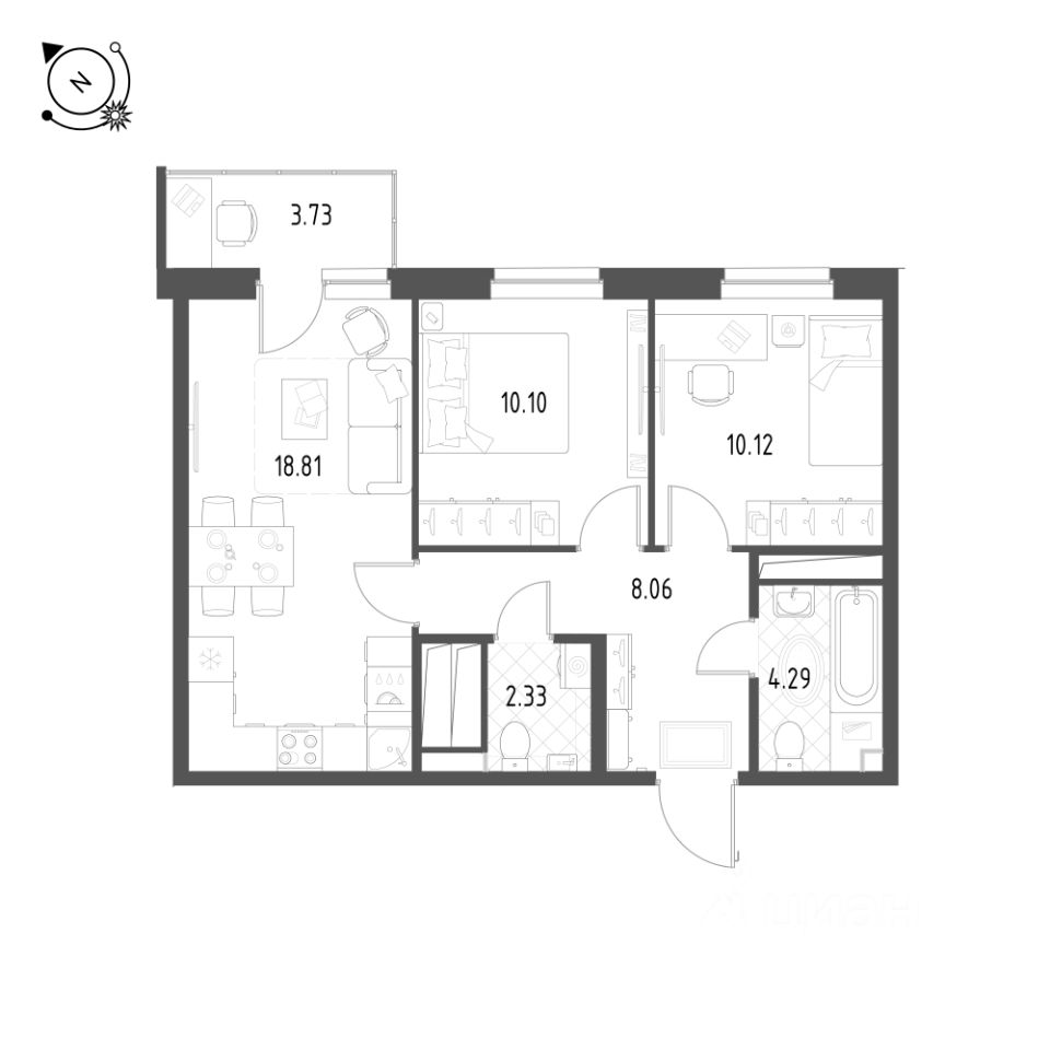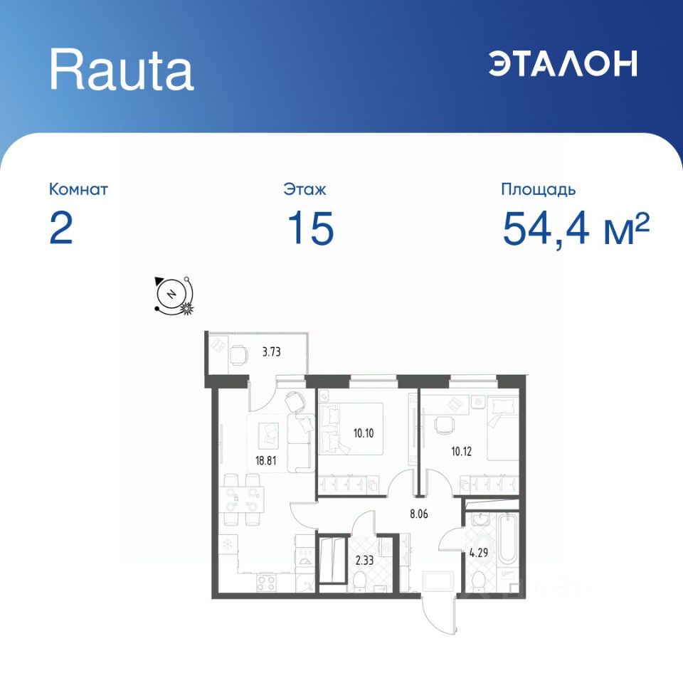 Общая площадь квартиры — 54.4 кв. м, этаж 15 из 25.