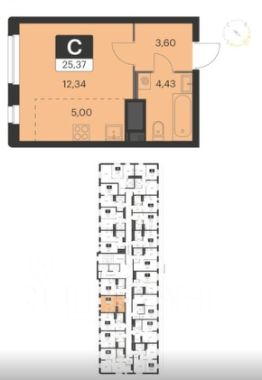 1) площадь: 25,4 кв. м;