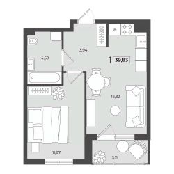 Кухня - правильной формы, удобно размещается кухонный гарнитур, обеденная зона и зона готовки