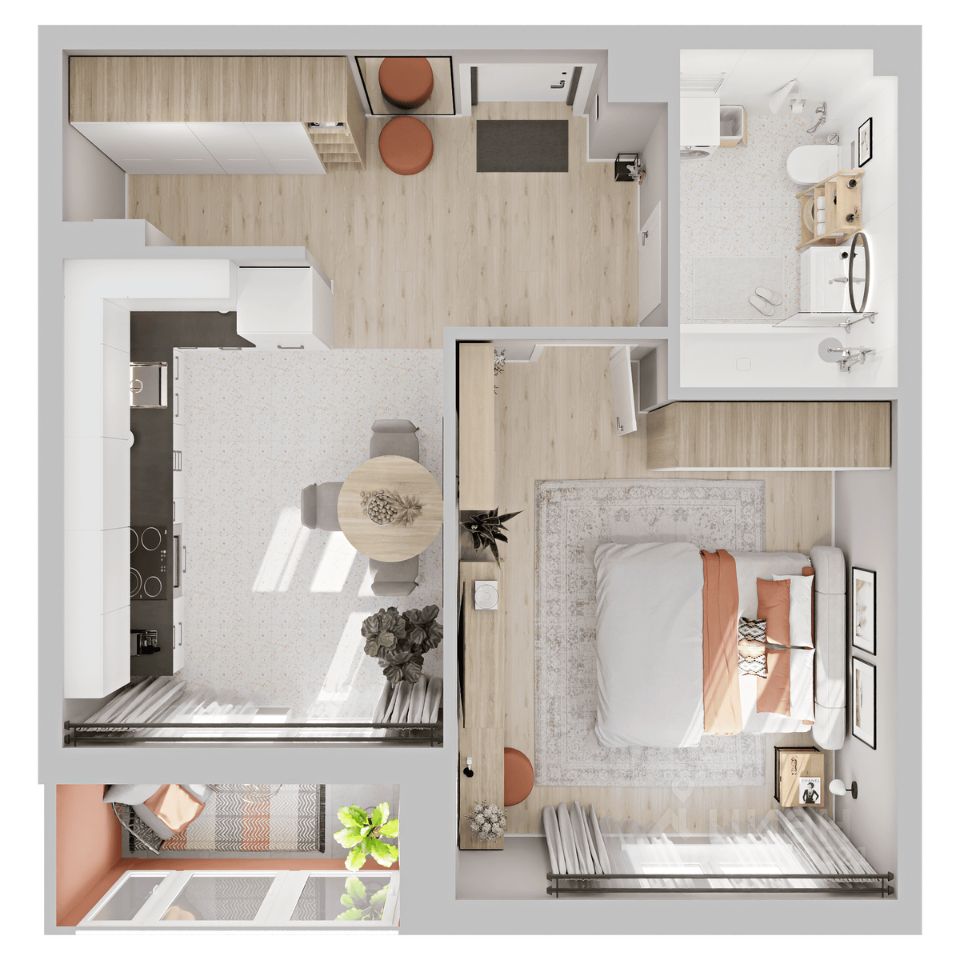 Жилая комната - изолированная, подходит для размещения кровати, шкафа и рабочей зоны