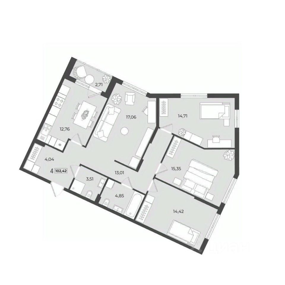 Просторная семейная планировка с чётким зонированием, где общественная и приватная части квартиры логично разделены и не пересекаются в повседневной жизни.