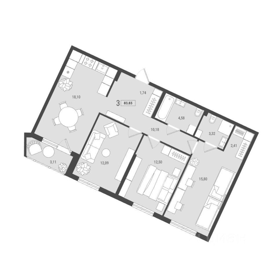 Просторная семейная планировка с чётким зонированием, где общественная и приватная части квартиры логично разделены и не пересекаются в повседневной жизни.