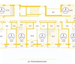 Общая площадь: 41,8 кв. м., жилая: 37,31 кв. м., площадь просторной кухни-столовой: 15,1 кв. м.