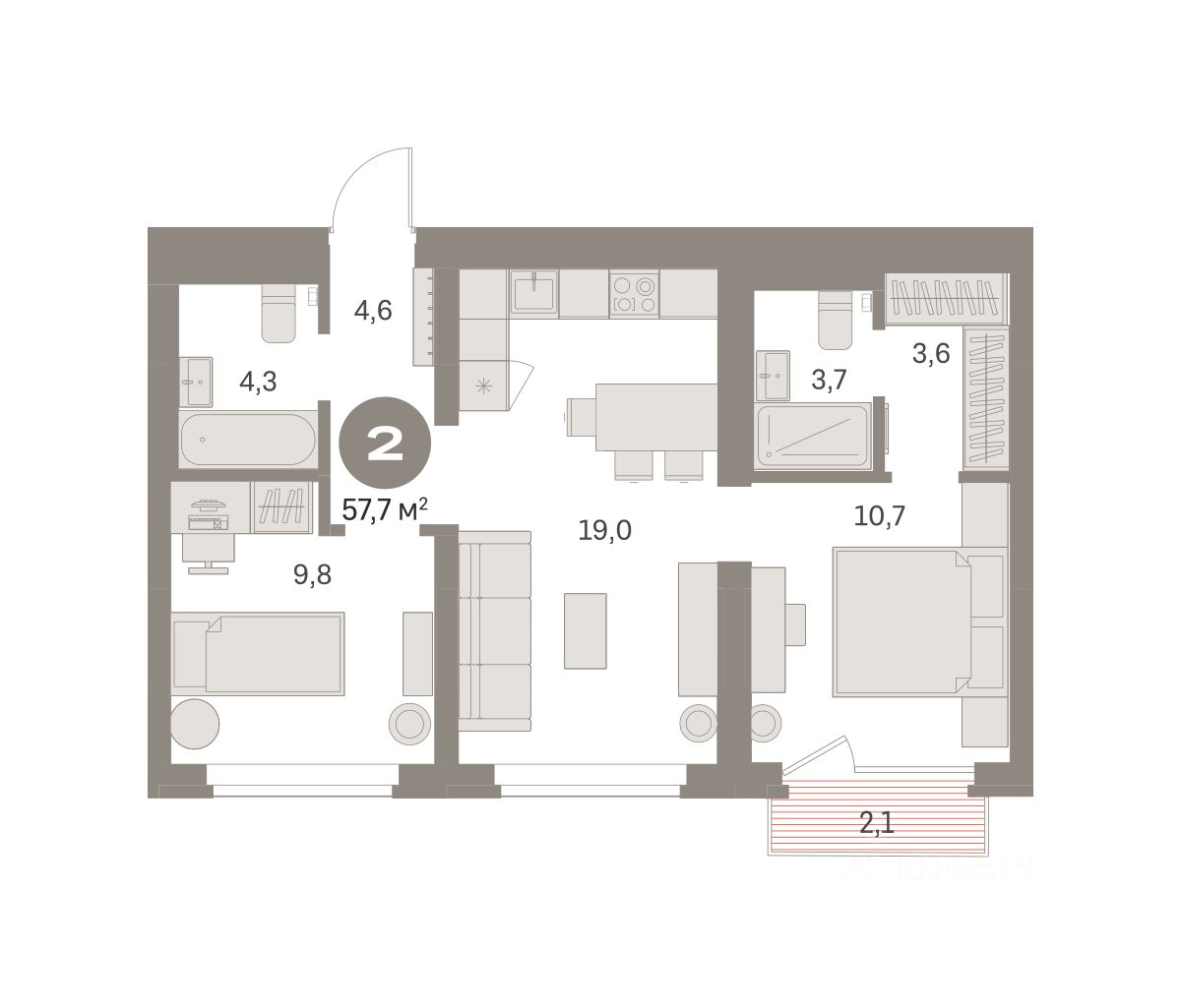 Квартира с кухней-гостиной и двумя спальнями в Бруснике в Академическом. Особенности планировки: балкон, второй санузел, гардеробная, мастер-спальня, предчистовая отделка, разнесённые спальни.