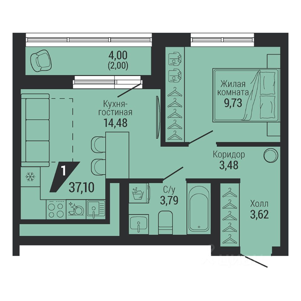 Общая площадь37,1 м²